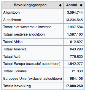 Zoals je kunt zien in de tabel hiernaast is de grootste groep inwoners van Nederland autochtoon (zijzelf en hun beide ouders zijn geboren in Nederland). Allochtonen zijn mensen die in het buitenland zijn geboren of van wie een van de ouders in het buitenland is geboren.