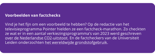 - Welkom bij de Factcheckfabriek: een werkvorm waarbij leerlingen in de rol van factcheckers kruipen om klimaatmythes en -uitspraken te onderzoeken en te beoordelen op hun juistheid. Ze presenteren dit op een Powerpoint of op een poster. De Factcheckfabriek is gebaseerd op Frank Ankersmit’s column in de Volkskrant ‘De Argumentenfabriek’. In de Argumentenfabriek ontleedt Ankersmit wetsvoorstellen en ideeën die in de voorgaande week voorbij zijn gekomen en ontkracht of onderbouwt ze deze door middel van argumentatie