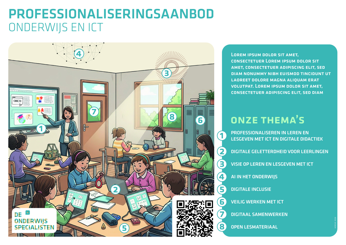 Aan de linkerkant vind je de thema's die terugkomen in onze professionaliseringsposter. Vind hier achtergrondinformatie en linkjes naar de workshops en webinars waarvoor je via Mijn Digitale Werkplek in kunt schrijven.