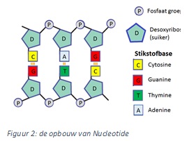 Als een chromosoom uit elkaar wordt getrokken, zal het DNA een helix/ dubbel spiraal vorm aannemen (figuur 1). Deze helix is een keten van nucleotide, een nucleotideketen. Een nucleotide is een molecuul bestaande uit een fosfaatgroep, een suiker (desoxyribose) en een stikstofbase. Deze stikstofbase kan verschillen tussen een adenine(A), een thymine (T),