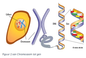 een cytosine(C), of een guanine(G). In de helix liggen er altijd 2 base tegenover elkaar. A ligt altijd tegenover T en C ligt altijd tegenover G. (zie figuur 2), dit wordt ook wel baseparing genoemd. Op het chromosoom liggen verschillende genen. Een gen is een reeks van nucleotide welke samen coderen voor bijvoorbeeld de oogkleur bruin. Deze reeks van nucleotide kan honderden baseparen lang zijn en een klein verschil kan al zorgen voor een andere werking. Zo kan een klein verschil in de baseparen er al voor zorgen dat een persoon geen bruine maar blauwe ogen heeft.