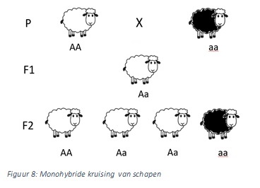 dominant of recessief overerft. tijdens zo een overerving wordt er vaak gekeken naar 1 of 2 eigenschappen. Als er naar 1 eigenschap wordt gekeken, wordt dit een monohybride kruising genoemd en als er naar 2 eigenschappen wordt gekeken, wordt dit een dihybride kruising genoemd. Om zeker te kunnen weten of een eigenschap dominant of recessief overerft, moet er doorgefokt worden tot een tweede generatie. De ouders waarmee wordt begonnen wordt de Parentes (Latijn voor ouders) generatie genoemd, dit wordt genoteerd als P. De eerste generatie (welke komt uit de kruising van de P generatie wordt de F1 generatie genoemd. De F komt van Filii wat in het Latijn Kinderen betekend. Vaak wordt deze generatie onderling voortgeplant waardoor er de tweede generatie ontstaat, ook wel de F2 generatie genoemd. Figuur 8 geeft een voorbeeld van de notatie bij schapen.