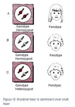 dit heet homozygoot. Indien de allelen niet gelijk zijn, dan heet het heterozygoot (figuur 6b). Als er vervolgens verder wordt gekeken naar het fenotype van figuur 6b, blijkt dat slechts 1 van de 2 genotypen tot uiting komt. het gen dat tot uiting komt (Krullen) is dominant en het gen welke niet tot uiting komt (Sluik) is Recessief. Indien niet 1 maar beide genen tot uiting komen (dus een combinatie) wordt dit Intermediair genoemd. Een voorbeeld hiervan is te zien in figuur 7, waarbij geen van de twee genotype sterker is dan de ander. Bij deze kippen is dus te zien dat er een combinatie van zwart en van wit ontstaat waardoor er de kleur grijs ontstaat voor de kip.