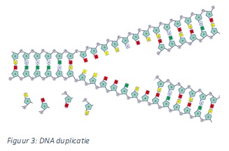 Vanwege de baseparing zullen er uiteindelijk 2 identieke strengen ontstaan en het gehele verdubbel proces heet DNA Replicatie. Nadat het gehele chromosoom is verdubbeld zal de cel de Mitose in gaan, waarbij de gehele cel wordt verdubbeld en er 2 dochtercellen zijn ontstaan (zie figuur 4).