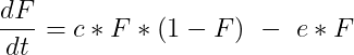 In this formula c*F*(1-F) equals the number of non-occupied patches that are being occupied from the occupied patches, while e * F equals the fraction of patches that go extinct during the day. This can be recalculated to a carrying capacity (CC) of