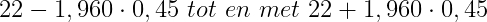 Dus stel dat van een steekproef de standaardafwijking van 3 is, de steekproefgrootte 45 en het gemiddelde 22. De standaardfout is dan 0,45. Het 95% betrouwbaarheidsinterval is dan dus